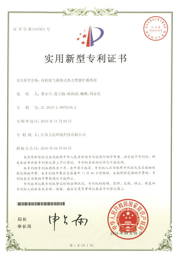 有机废气蓄热式热力焚烧炉蓄热墙专利证书